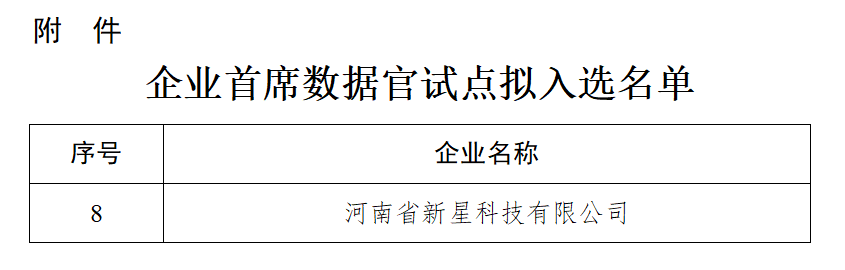 2024年8月28日,河南省工业和信息化厅公示了企业首席数据官(CDO)试点拟入选名单,新星科技凭借优越的数据管理能力和创新应用能力成功入选。